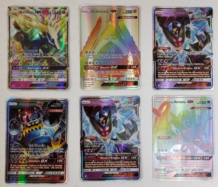 Pokemon - six holographic 'shiny' GX Ultra Beast examples, 2017 series, Guzzlord, Celesteela, Xerneas, three Dark Wing Necrozma