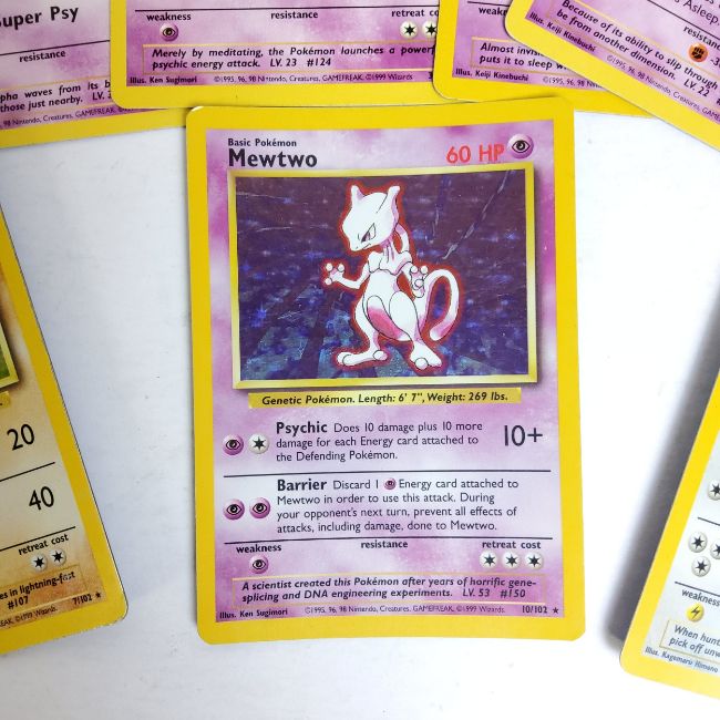 Basic Pokemon Cards - A holographic 'shiny' Mewtwo Basic Pokemon card, number 10/102; a holographic Pidgeot, evolves from Pidgeotto, number 8/64; holographic Hitmonchan number 7/102; various Electric pokemon including Electrabuzz, Pikachu, Electrode, etc, water element cards including Squirtle,Poling, Seaking, Vaporetto, Omanyte, Sturminster, Dewgong,etc, Gas element including Kadabra, Drowzee, Abra,etc, Bulbasaur, Butterfree, Lickitung,  Porygon, Charmander, Charmeleon, Onix, Machoke, various trainer and element cards,etc qty