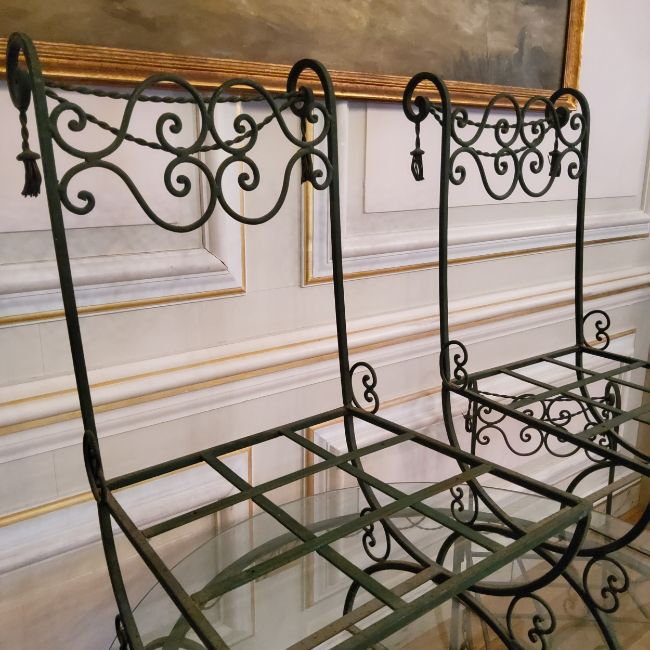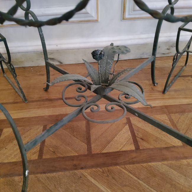 Outdoor Furniture - A seven piece wrought set with a large glass top table (120cm dia). Six decorative rope twisted swag wrought iron chairs (each) 46cm w x 40cm deep x 81cm high