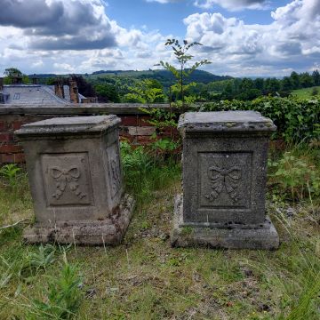 A pair of reconstituted gritstone garden plinths, Neo Classical ribbon tied bow decoration to each side panel, 61cm H x 44cm D x 44cm W