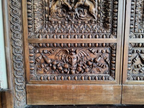 A pair of French 19th century Napoleon III style Chateau internal carved walnut double doors complete with original architrave and hidden brass hinges, the four main panels carved with rampant lions supporting a slender column surrounded by foliage, the four upper & lower smaller panels carved with winged medusas above fruit, the central panels carved with central snakes above a gilt bronze winged medusa mask handle, flanked by two dragons, 2.5m high Provenance - In 1923 a builder built his own red brick house in Dronfield, Derbyshire, the doors were installed by the builder at the time between the sitting and dining room, unfortunately where they came from was a mystery. The house was sold in 1962 who owned it for the next 60 years, the third owners who are now modernizing the property have decided they belong in an environment more fitting.