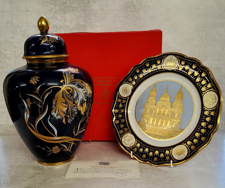 Decorative Ceramics - a Spode limited edition The St. Paul's  Royal Wedding cabinet plate,  no.836/1,000, boxed with certificate; a Jaeger Ceramics urn and cover, cobalt blue ground with gilded flower decoration.(2)