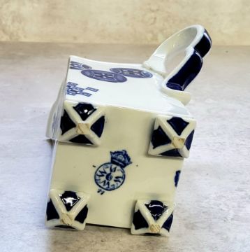 A Royal Worcester Aesthetic Movement square-section cream jug, gros bleu scroll handle, inverted pyramidical feet, 12cm high, printed mark, date cypher for 1877