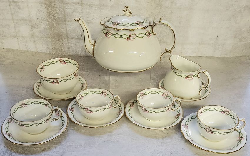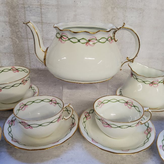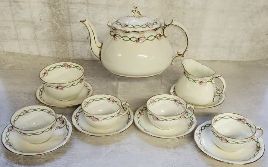 A 1920's Royal Crown Derby part tea service for four, handpainted  with a green ribbon & pink bow borders, pattern no. 6918 comprising teapot, milk jug, sugar bowl, four teacups & saucers, two saucers, date mark 1923