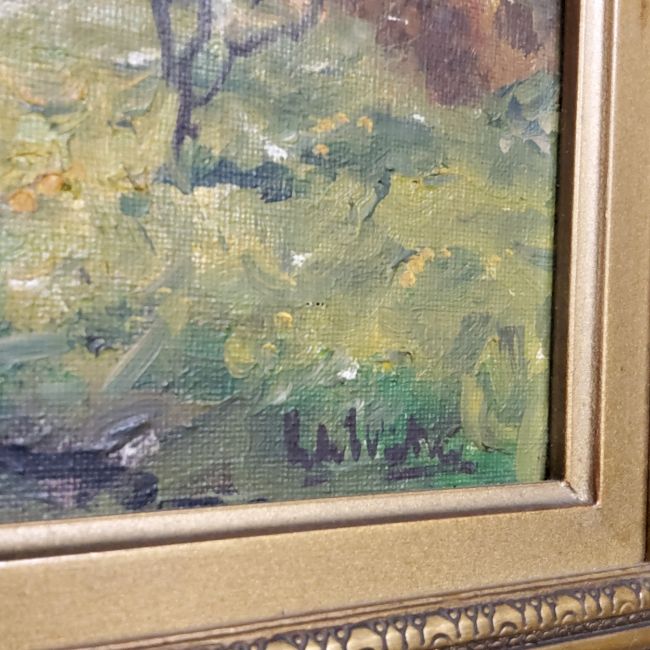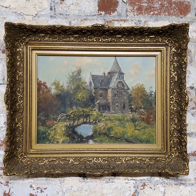 Dutch School (Early 20th century) Country House  Oil on canvas, indistictly signed. Period ornate gesso frame. 60cm x 46cm