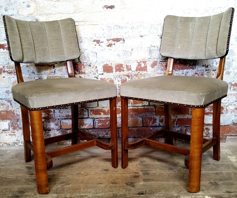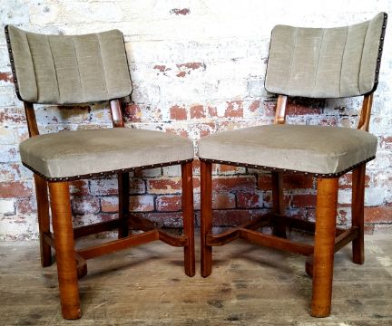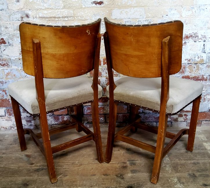A pair of Art Deco walnut and bentwood bedroom chairs c.1930 with 'T.B&W. Cockayne Cabinet Makers & Co .Sheffield' label to verso. Studded leather fixtures to rim with shell shaped bowed back.