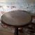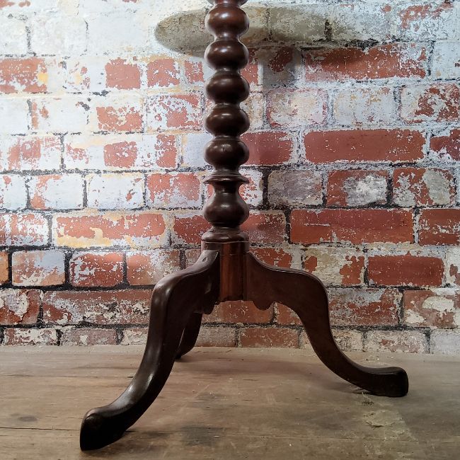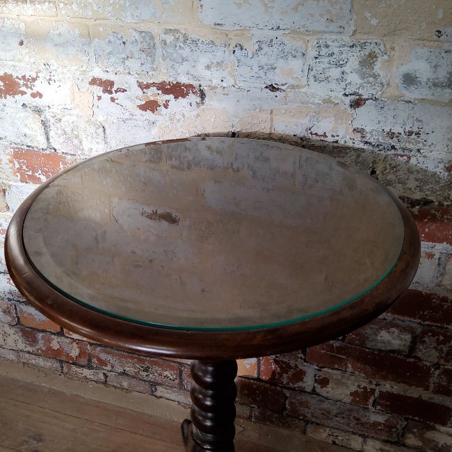 A late Victorian mahogany one piece dished top circular occasional/wine table, bobbin turned column and tripod supports c.1900, bevelled glass inset. Good condition.