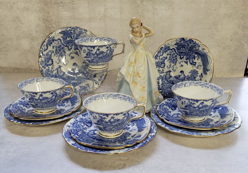 A Royal Crown Derby Blue Aves pattern part tea service; a Royal Doulton elegant lady titled Laura, printed marks to base, HN2960