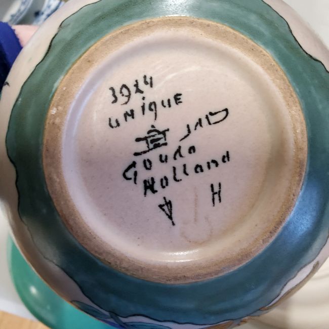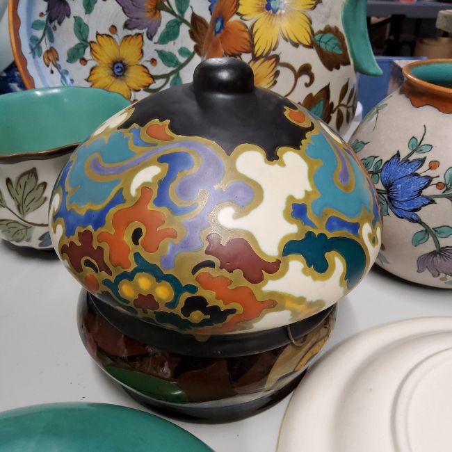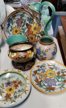 Gouda Pottery - a collection of Gouda pottery examples including ewer, bowls, cabinet plates etc