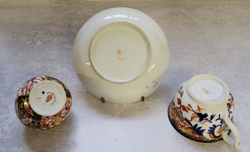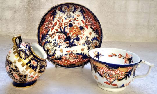 A Royal Crown Derby 1299 pattern small salt pig 9cms high, c.1905; a Royal Crown Derby teacup & suacer decorated in the Imari pallete, red painbted marks c.1820