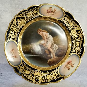 A signed 19th century Royal Vienna cabinet plate, titled 'Sylphide', decorated with a Continental beauty gazing at her reflection at the rivers edge, bold cobalt border with intermitted putti panels with gilt decoration c.1880. Beehive mark to base. 24.5cm diameter. excellent condition.