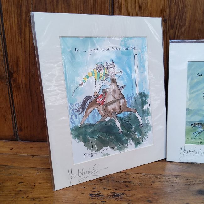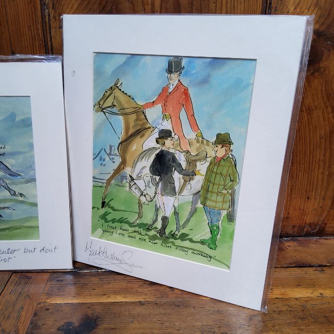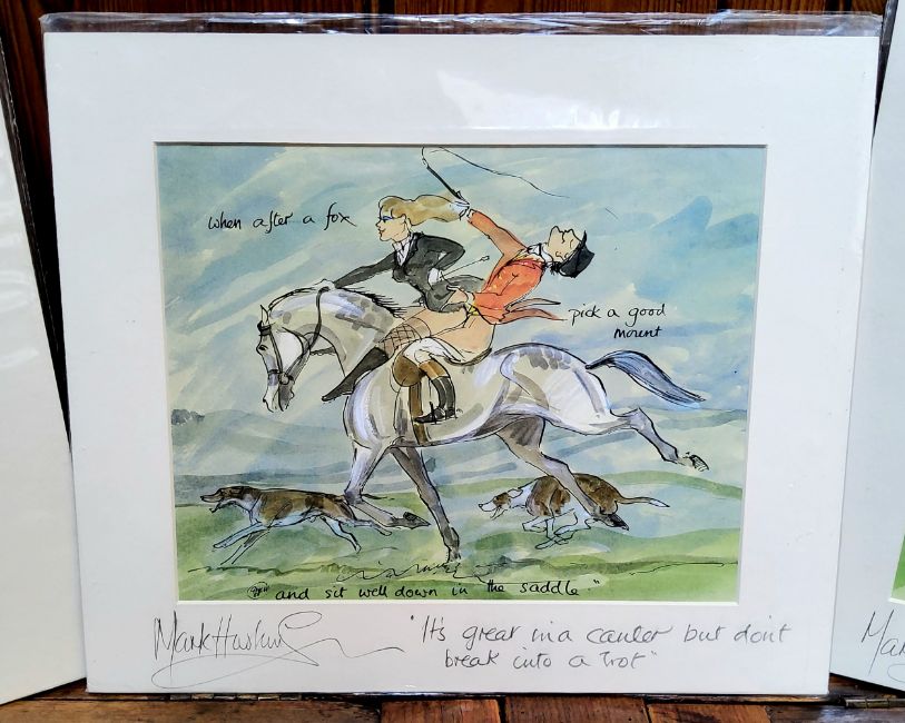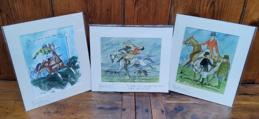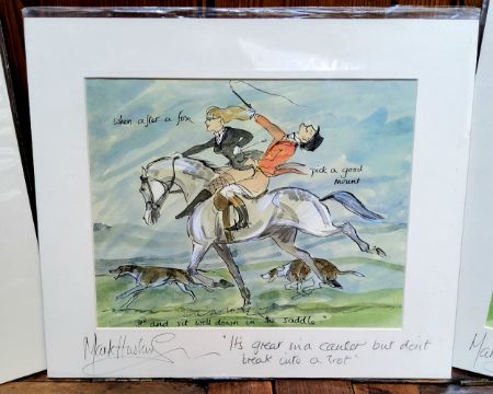 By and After Mark Huskinson, risqué equestrian themed prints, signed in pencil to margin, one annotated to margin, in original plastic protective sleeve. " When after a fox pick a good mount, and sit well down in the saddle" etc (3)
