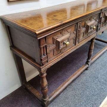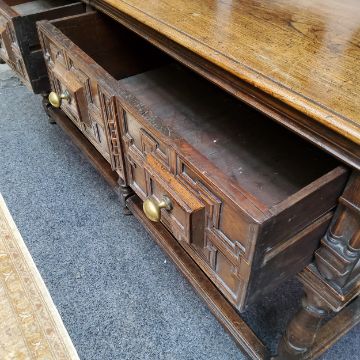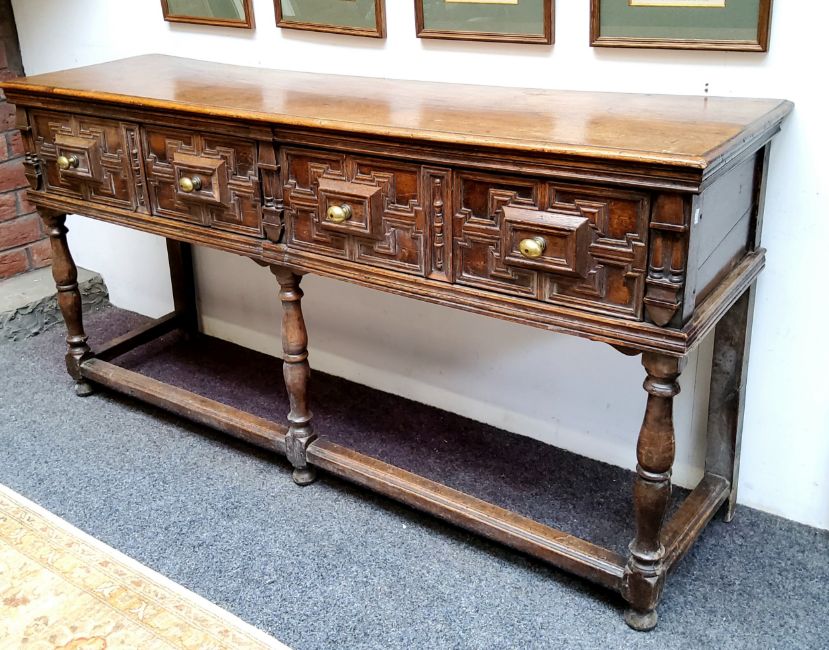 A Charles II Revival oak block front dresser base, moulded rectangular top, the frieze fitted with two large block fronted drawers, turned legs, block stretcher, stile back legs, 92cm high, 183cm long, c.1840