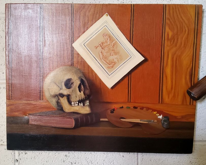 A** Fremont, Still Life, Skull, Artist Pallet and Book, signed, oil on canvas, 50cm x 60cm, unframed