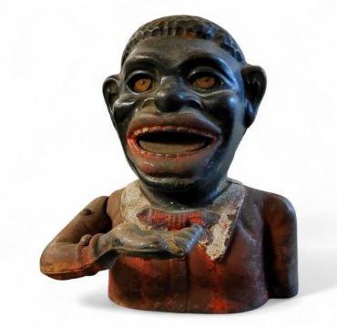 A Victorian cast iron Jolly black man money bank,  16cm high Notice from the the-saleroom.com: These items are listed on the basis they are illustrative of a bygone culture in which there were different social norms. We understand the potential controversy surrounding this type of item but believe that providing transparent information about historical context fosters greater understanding of our complex cultural history.