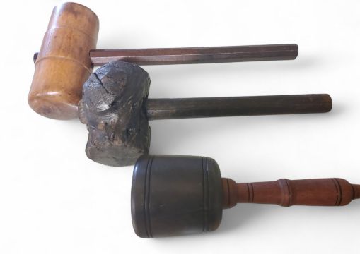 A rustic hammer, 28cm long;  a large gavel, 35cm long;  a mallet (3)