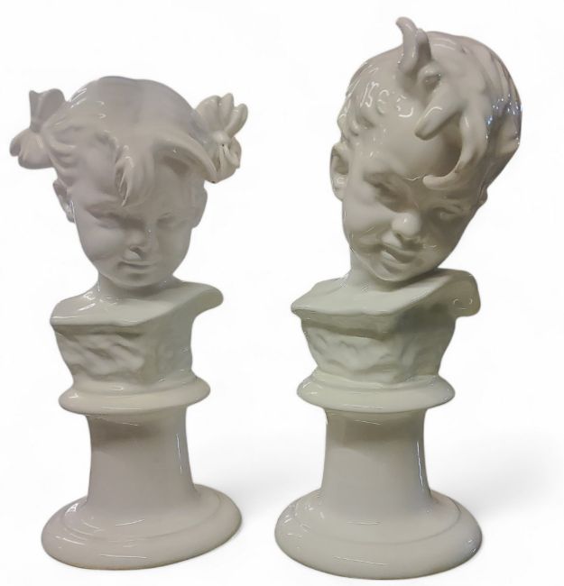 A pair of 20th century busts, in the white, of a boy and a girl, on pedestals, 31cm high,  marked Made in Portugal
