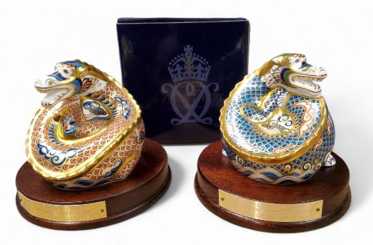 A pair of Royal Crown Derby Millennium Dragon paperweights, Dragon of Good Fortune and Dragon of Happiness, exclusives to Peter Jones of Wakefield & Leeds, 974/1,500  and 308/1500, printed marks in red, gold stoppers, certificates, circular mahogany stands, one box